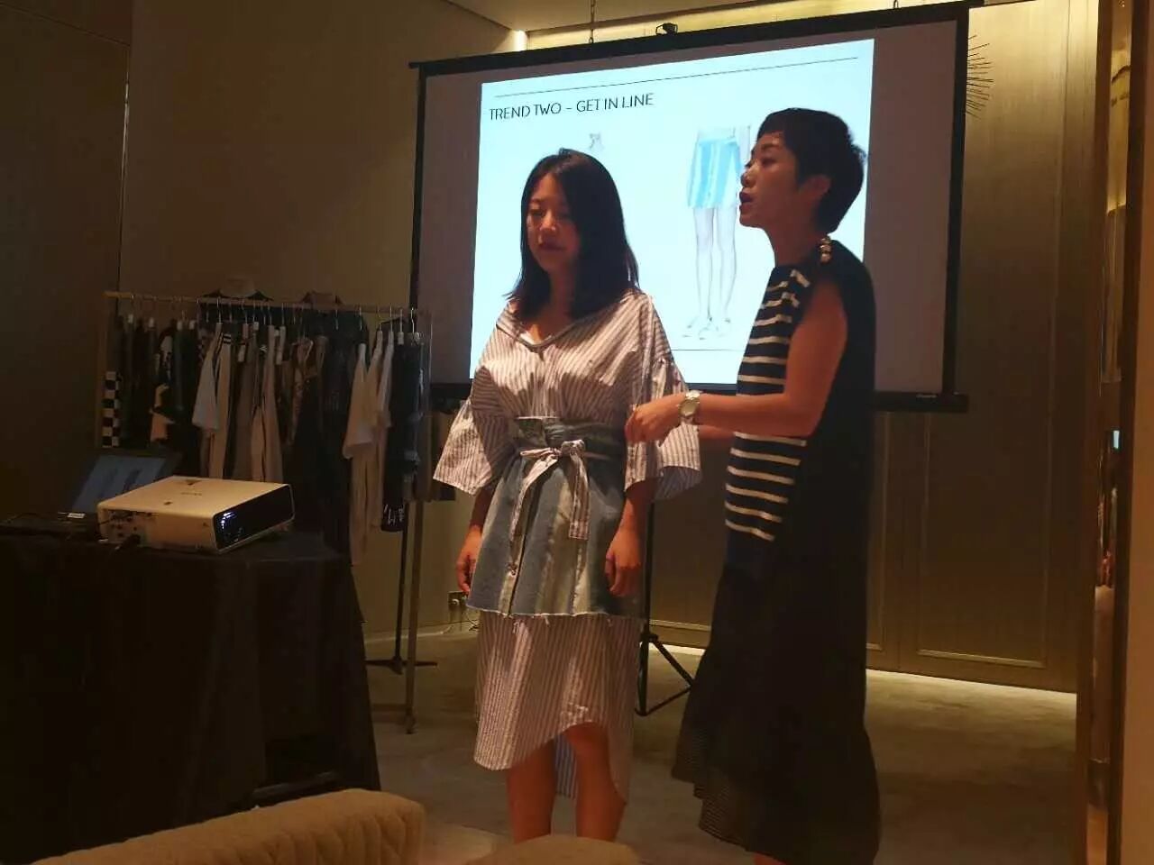 连卡佛形象顾问Mable Zhang就今年街头风流行的时尚元素格纹、条纹,衬衣领口的下拉、复古印花、宽松连衣裙等穿搭进行了分享。