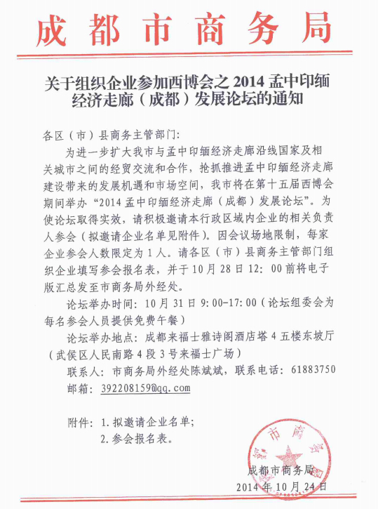 成都零售商协会转发成都市商务局关于组织企业参加西博会之2014印中孟缅经济走廊(成都)发展论坛的通知
