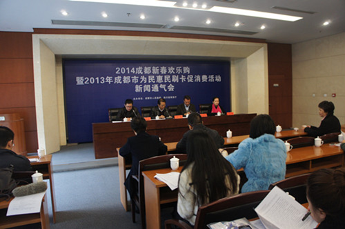 11月28日上午,2014成都新春欢乐购暨2013年成都市为民惠民刷卡促消费活动新闻通气会在市政府第四办公区A座101会议室举行,成都市商务局副巡视员石平、人民银行成都分行营业管理部副主任李宏伟、成都旅游协会权益保障部部长周丽伟出席,成都零售商协会秘书长宋建朝主持会议。 发布会现场,共有来自中央及省市30余家新闻媒体到场。会上,成都市商务局副巡视员石平发布2014成都新春欢乐购相关情况:首次“政银”联合,抽奖返现鼓励刷卡消费;整合信息、零售、电商资源,跨界经营促消费;打造品牌传承文化,引领时尚消费潮流;线上线下联动,助推蓉城电商发展;20个区(市)县联动,引爆全城消费热潮。人民银行成都分行营业管理部副主任李宏伟介绍了2013年成都市为民惠民刷卡促消费活动相关情况。 人民银行成都分行营业管理部副主任李宏伟、成都零售商协会秘书长宋建朝、成都旅游协会权益保障部部长周丽伟出席分别就2013年成都市为民惠民刷卡促消费活动及2014成都新春欢乐购相关情况回答记者的提问。