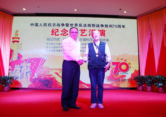 在中国人民抗日战战争胜利70周年之际,中共中央、国务院、中央军委决定,向健在的抗战老战士、抗战将领、老同志颁发“中国人民抗日战争胜利70周年纪念章’,充分体现了党中央对抗战英雄的崇高敬意和深切关怀,充分体现了国家对历史的深刻铭记和对伟大抗战精神的大力弘扬。根据成都市国资委的统一部署,在汇演现场,公司非常荣幸的请来了曾参加过抗日战争的离休干部高培祯同志,由公司党委书记蔡明同志在汇演现场为高培祯同志颁发“中国人民抗日战争胜利70周年纪念章”,表达了公司全体职员对抗战英雄的崇高敬意。