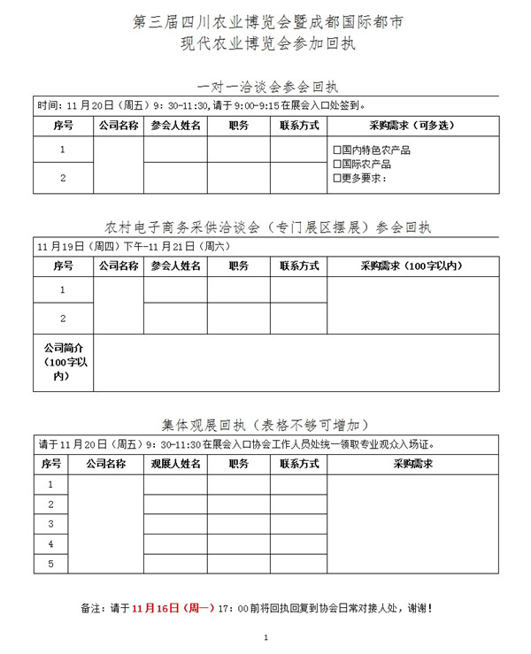 《第三届四川农业博览会》参会回执