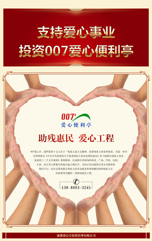 007爱心亭是成都零零柒超市投资公司联合相关部门共同打造公益项目,主要是为残疾人和下岗工人提供就业。在成都已有10个试点成功,提供就业岗位30个,其中安置残疾人就业22个,每个爱心亭日平均营业2300元,毛利29.3%!