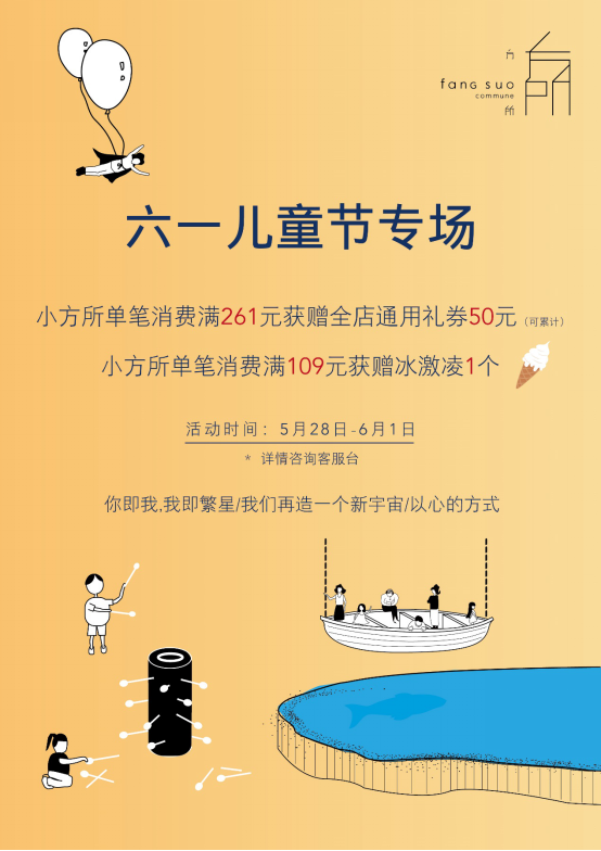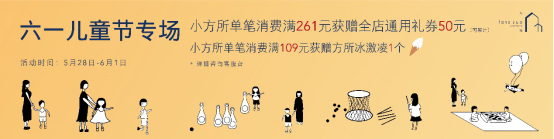 1、凡单笔购买小方所商品满261元,即可赠送50元全店通用礼券,可累计赠送(礼券在6.2-6.12内使用)。